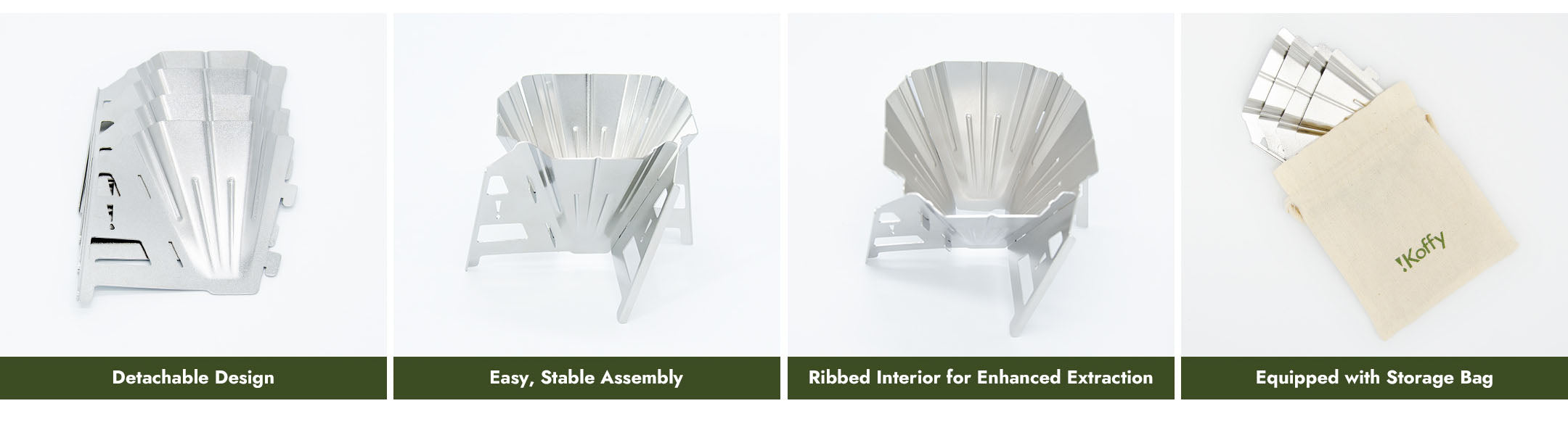 ポータブルで省スペースなデザイン:折りたたみ式でコンパクト。4 つのパーツに分解でき、付属のトラベルポーチに簡単に収まるため、外出先でコーヒーを楽しみたい方に最適です。