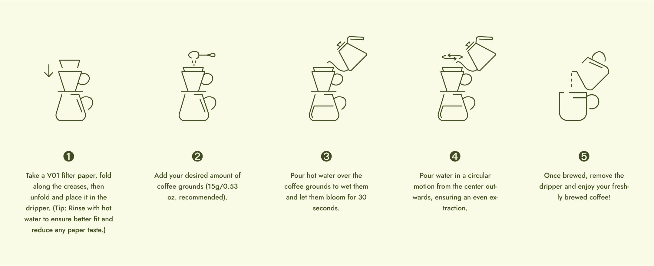 独自のリブ付き壁により、CO₂の放出が速くなり、水がコーヒー粉に完全に浸透します。高流量、低バイパス設計により、過剰抽出を最小限に抑え、コーヒーの自然な酸味、甘み、透明感を高めます。