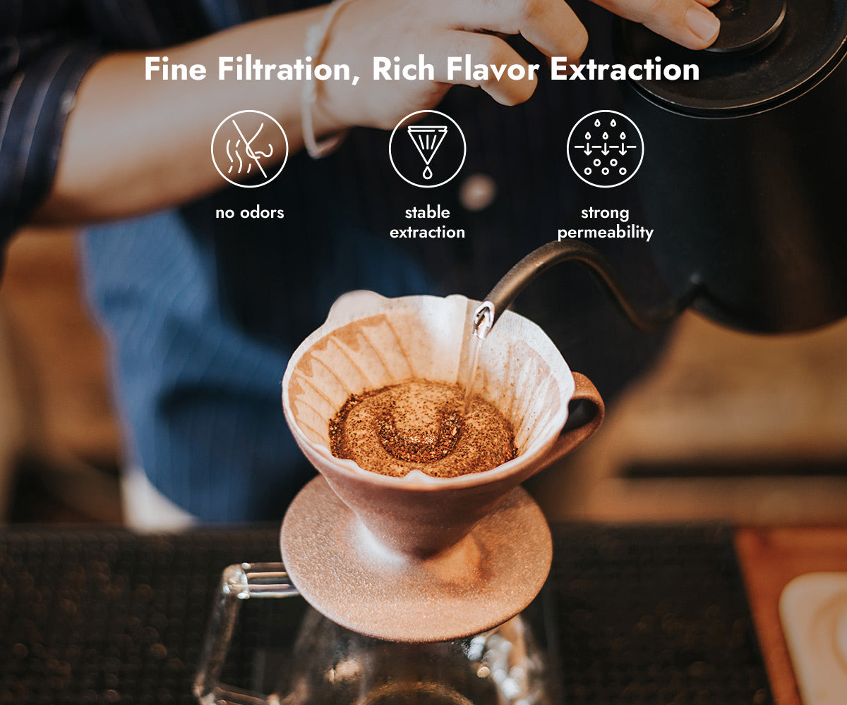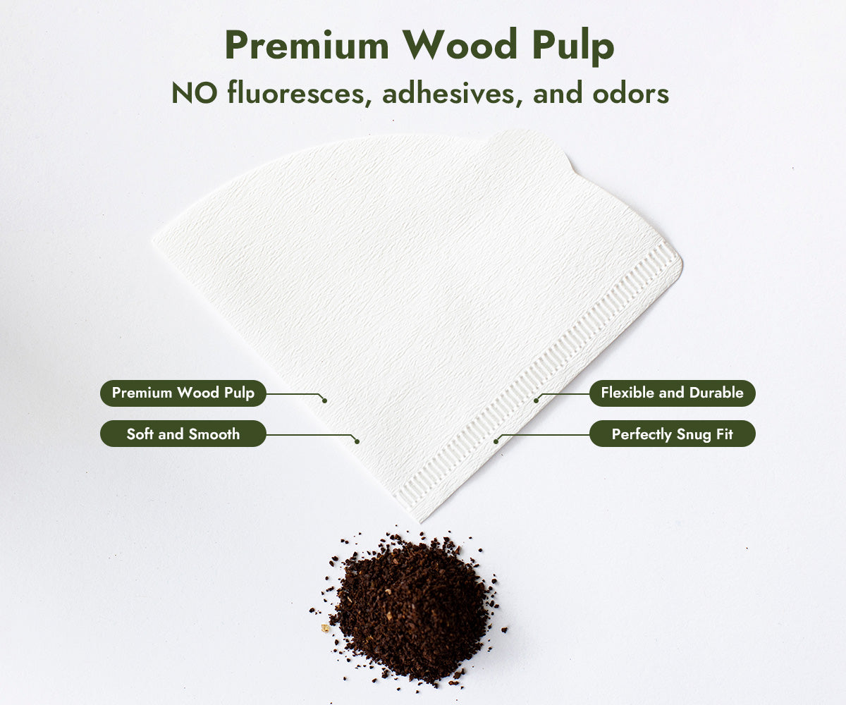 天然の木材パルプから作られた当社のフィルターは、蛍光物質、接着剤、臭いがなく、不要な風味のないクリーンで純粋なコーヒー体験を提供します。 -