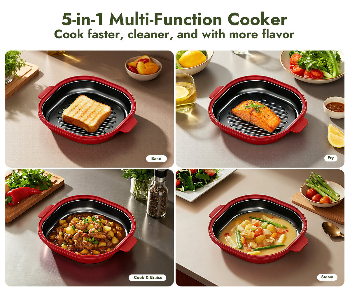 Grill, bake, fry, steam, or braise — all with one versatile cooker.